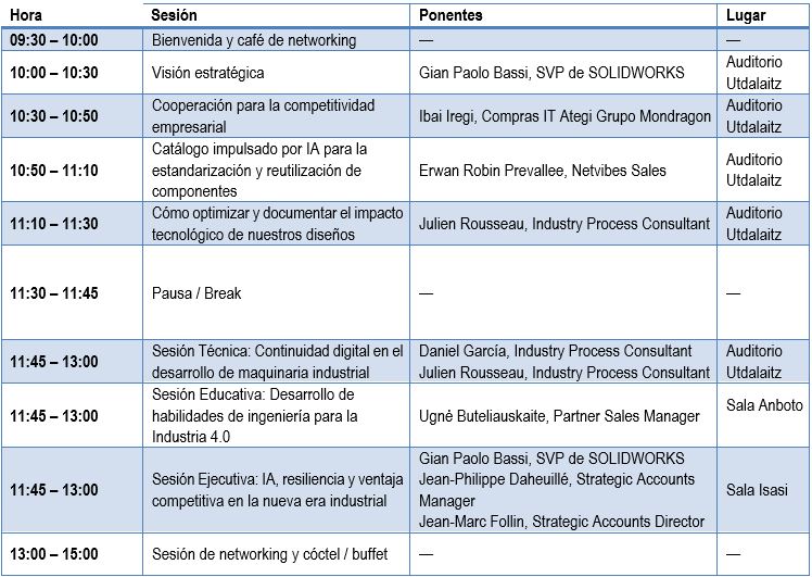 En industria, innovar ya no es opcional. La inteligencia artificial (IA) y los gemelos virtuales se han convertido en palancas para mejorar procesos y acelerar decisiones. Muchas empresas ya están viendo ganancias de productividad superiores al 40% y ahorros al conectar diseños, datos y operación en un mismo flujo. Con motivo del 30º aniversario de SOLIDWORKS, te invitamos a un evento presencial el martes 23 de septiembre en GARAIA Parque Tecnológico de Arrasate, Gipuzkoa. Líderes de la industria compartirán cómo están transformando sus operaciones con IA, diseño 3D y plataformas colaborativas como 3DEXPERIENCE. Por qué asistir: