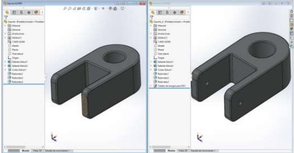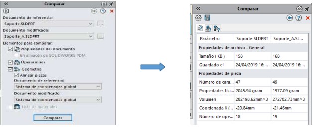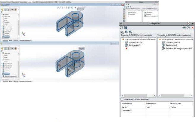 Nos detecta cambios en un redondeo, en un corte y en un taladro que en la primera versión no existe y en la segunda sí. Incluso nos representa los diferentes valores en la tabla inferior.