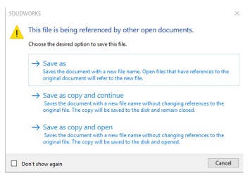 Los tres comandos mostrados arriba son Guardar como, Guardar como copia y continuar, y Guardar como copia y abrir. Es posible que hayas usado el comando Guardar como muchas veces antes, sin que se te lo solicite con este diálogo, esto es porque sólo aparece cuando un documento padre, como un ensamblaje o un dibujo, ya está abierto en SOLIDWORKS. En otras palabras, si no ve este diálogo, no hay que preocuparse. Sin embargo, si lo ves en pantalla, considera cuidadosamente las opciones y haz clic en la selección apropiada, sabiendo lo que supone.