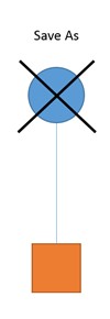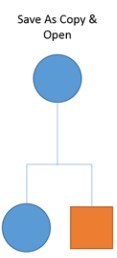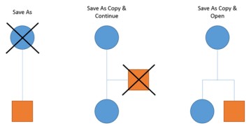 Las diferentes opciones de Guardar como funcionan de acuerdo con el gráfico que figura a continuación, donde el círculo azul representa el archivo con el que está trabajando actualmente y el cuadrado naranja representa el nuevo archivo que está creando.