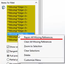 En ocasiones, cuando modificamos una pieza y actualizamos operaciones puede pasar que operaciones de redondeo y chaflan que tenemos por debajo en el árbol pierdan referencia a las aristas que tenían seleccionadas. Esto hacia que se tuviera que volver a seleccionar todas estas aristas. Pero existe un funcionalidad que te permite volver a referenciar todas esa aristas. Simplemente haz clic derecho sobre las aristas perdidas y selecciona Reparar todas las referencias que faltan.