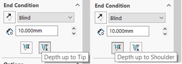 Se puede definir la condición final de un taladro como la profundidad hasta la punta del taladro o del reborde. Las opciones están disponibles para todas las operaciones del Asistente para taladro (incluida la operación Ensamblaje de Asistente para taladro) y tipos de Taladros avanzado.