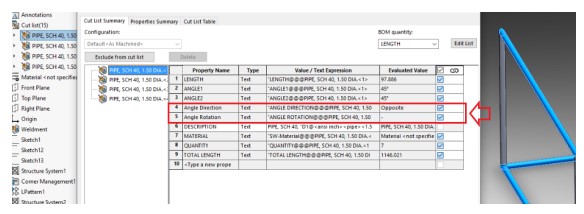La dirección y rotación del ángulo se muestra en las propiedades de la lista de corte, que también están disponibles para los miembros estructurales y las soldaduras de SOLIDWORKS.
