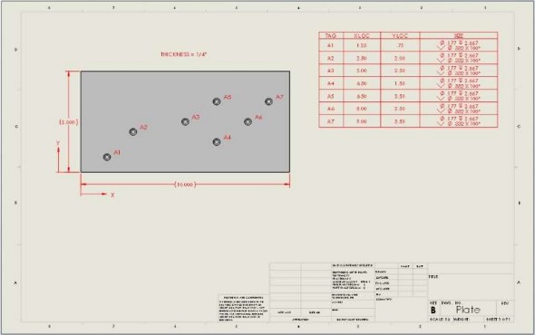 Una tabla de taladros es una excelente manera de transmitir información sobre los agujeros de una manera cómoda, clara y organizada. Las columnas se pueden crear para mostrar información como un identificador en los taladros, el tamaño, la ubicación, etc.