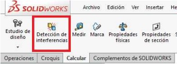 El cálculo de Interferencias en el entorno pieza se ejecuta de la misma forma que en el entorno ensamblaje. Esta herramienta llamada “Detección de Interferencias” se ubica en la pestaña “Calcular”.