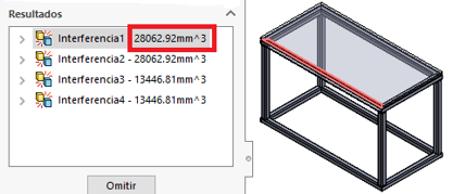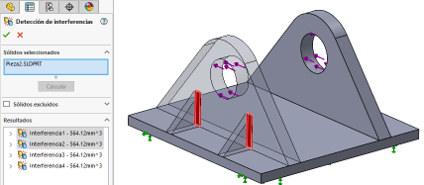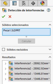 Una vez disponemos de la pieza multicuerpo, ejecutamos la Detección de Interferencias y el sistema, de forma automática, va a calcular el volumen de interferencia entre los diferentes sólidos.