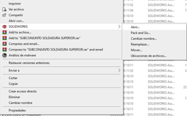 Para acceder a estas utilidades, en el Explorador de archivos, hacemos clic con el botón derecho del ratón en un archivo de SOLIDWORKS (.SLDPRT, .SLDASM, .SLDDRW).