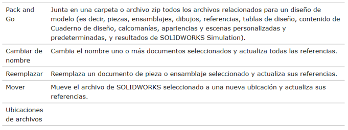 Se trata de un conjunto de utilidades integradas en el menú contextual de Windows. Permite realizar tareas como cambiar el nombre, reemplazar y mover archivos de SOLIDWORKS, sin perder las referencias.
