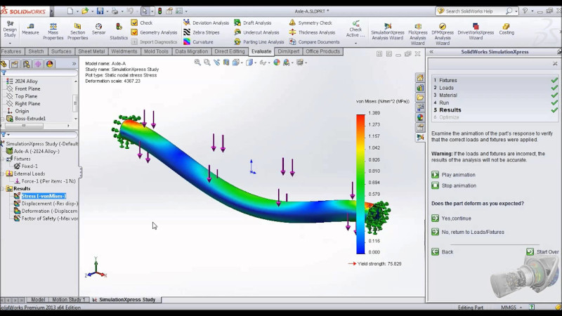 SOLIDWORKS SimulationXpress es una herramienta preliminar que se incluye en los paquetes de software SOLIDWORKS Standard y SOLIDWORKS Professional, y que te permite realizar un análisis de tensiones básico de las piezas individuales. Puedes determinar rápidamente los efectos de la fuerza y la presión, y generar informes para documentar los resultados. Cuando estés preparado para probar los ensamblajes completos, podrás actualizar fácilmente a los paquetes avanzados de SOLIDWORKS Simulation.