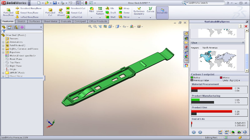 La tecnología de SOLIDWORKS SustainabilityXpress te permite realizar un análisis de ciclo de vida (LCA) directamente en los diseños de piezas individuales para ayudarte a conocer el impacto ambiental de tus decisiones de diseño.