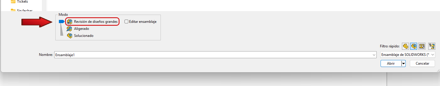 Es interesante utilizar la Apertura Selectiva y la Selección Avanzada si se utiliza la Revisión de diseños grandes que nos permite agilizar la selección de componentes. Siempre que vayas a abrir un archivo puedes seleccionar el modo «Revisión de diseños grandes» en la misma ventana.